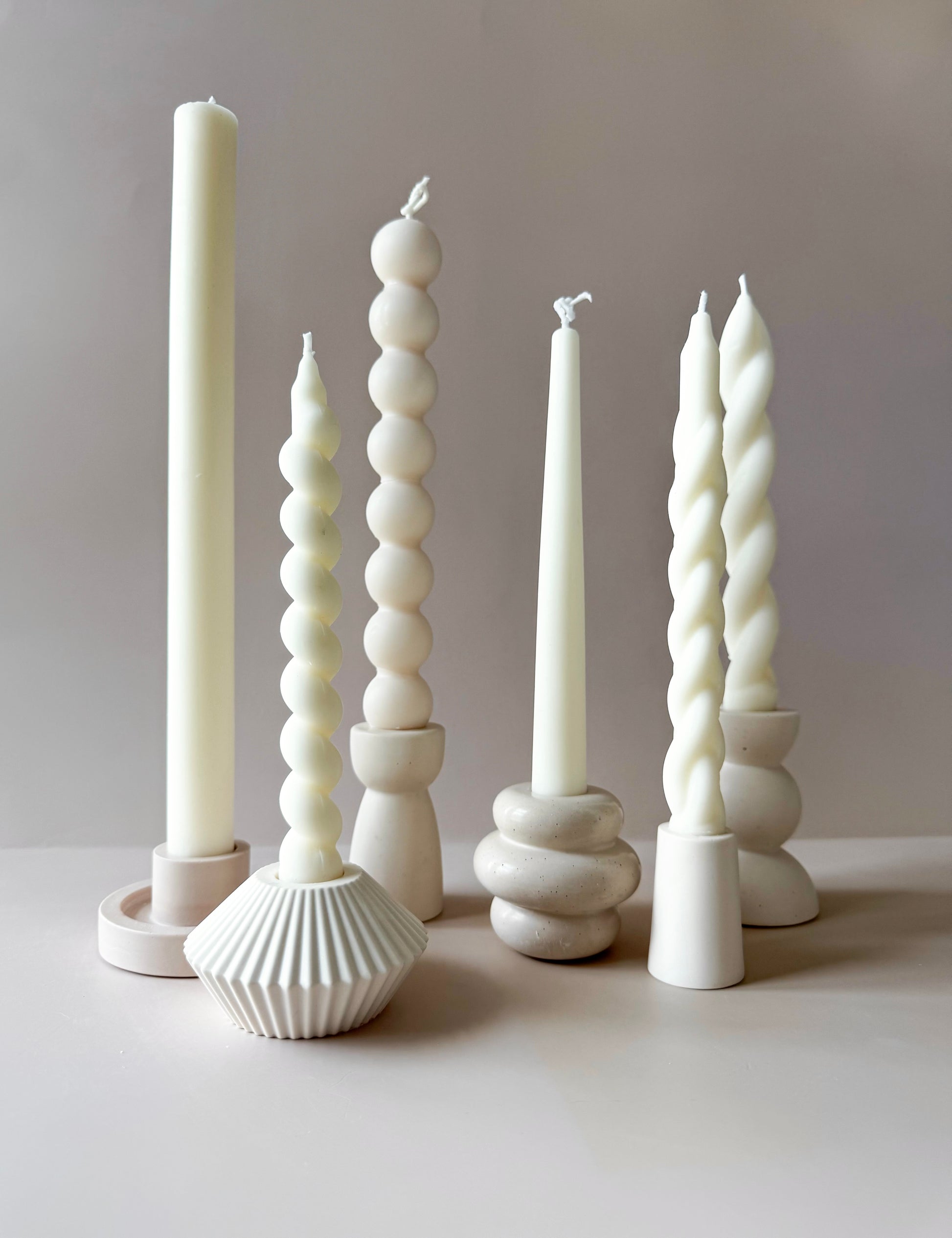 A stacked, sculptural taper holder with fluted ridges and a balanced, architectural form. Its modern silhouette adds quiet elegance to any space — whether styled solo or as part of a set.