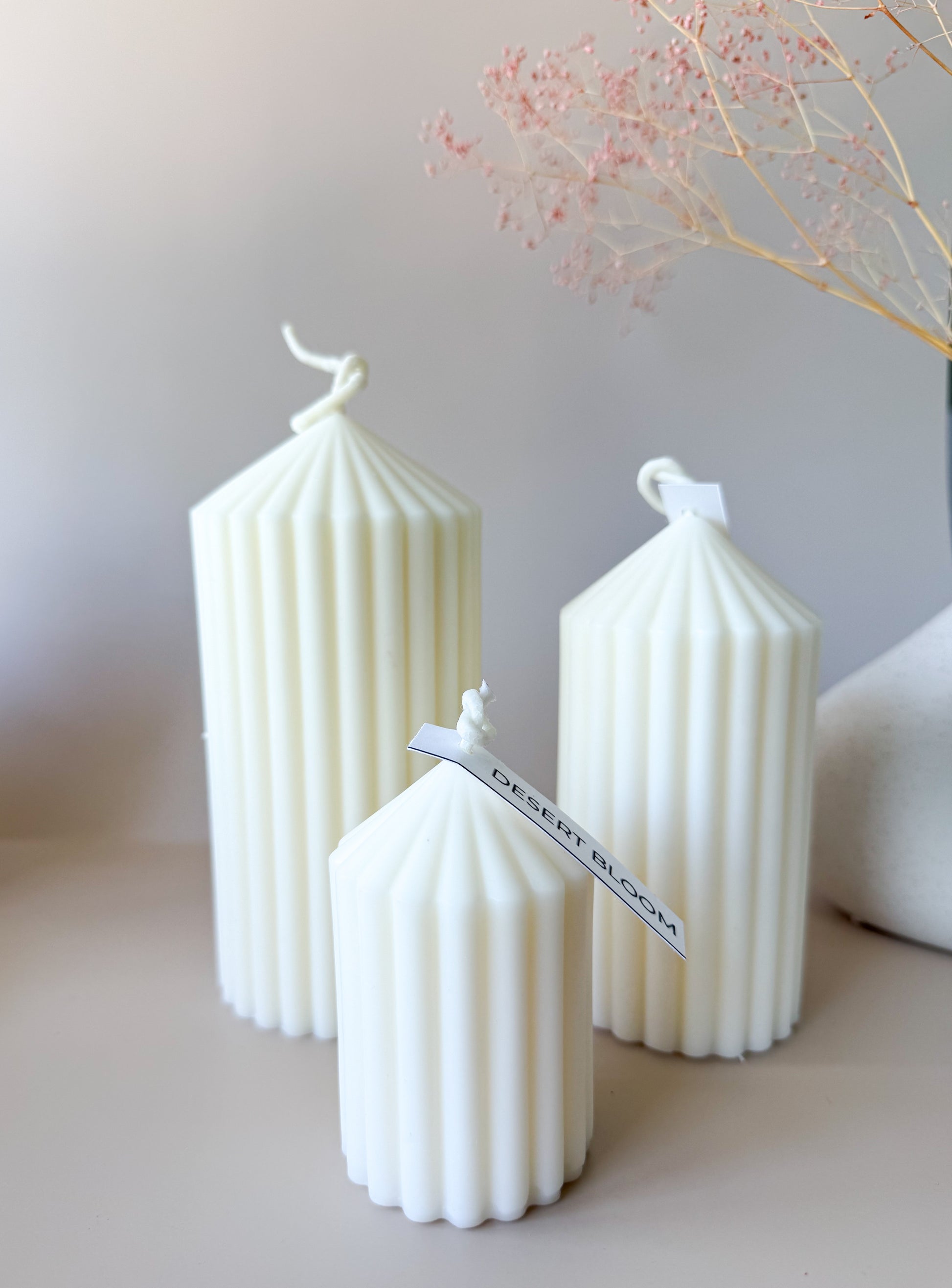 A nod to tradition with a modern touch, this trio of sculptural pillar candles brings warmth and quiet elegance to any space. Each features soft ridges and curved silhouettes, reimagined in clean-burning beeswax and organic soy wax.